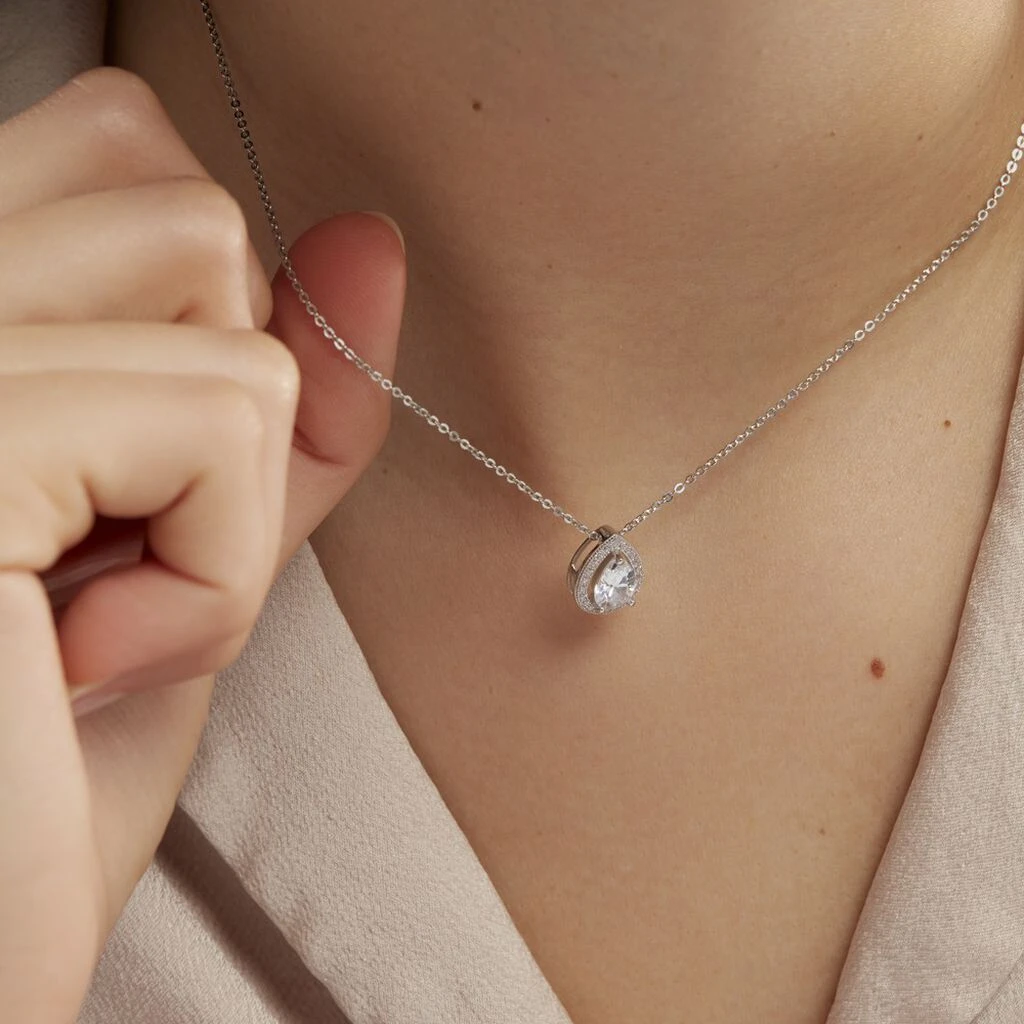 Collier Argent Blanc 925/1000 Solitaire Oxyde De Zirconium Central Forme Poire Entourage Oxydes De Zirconium 45cm